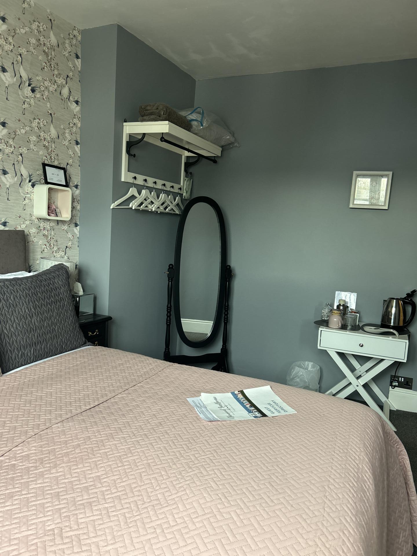 A comfortable 2nd floor double room situated at the rear of the building.Stylishly redecorated in 2026,furnished with a king size bed,hanging rail/shelf, stool, freestanding mirror and bedside cabinets with lamps. En-suite shower room. In addition, a hair dryer, complimentary toiletries and a hospitality tray are provided.